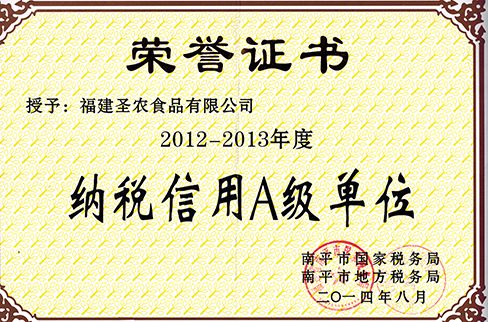 2014年8月(食品)2012-2013年度南平市納稅信用A級單位
